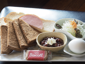 | 商品説明 | トーストは十穀パン。十種類の穀物を使用した耳のない山パンです。 |
